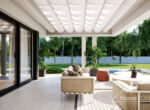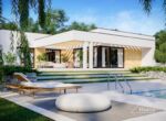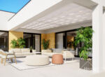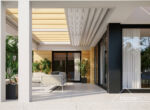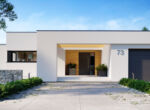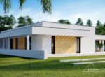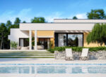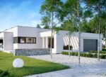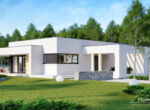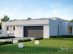 HomeKONCEPT 73 to projekt domu parterowego dedykowany miłośnikom nowoczesnej architektury, oryginalnego wyglądu i bardzo komfortowych wnętrz. Bryła domu w kształcie litery L została przykryta płaskim dachem. Jasną, świetlistą elewację skomponowano z tynku cienkowarstwowego oraz naturalnego drewna. Strefę wejściową do budynku oraz taras ozdabia ażurowa pergola, tworząca wyjątkowy klimat i osłaniająca wypoczywających domowników przed intensywnym nasłonecznieniem. Wysunięty do przodu garaż został zaprojektowany na 2 samochody osobowe. Kontrastująca z elewacją stolarka okienna podkreśla nowoczesny charakter budynku.